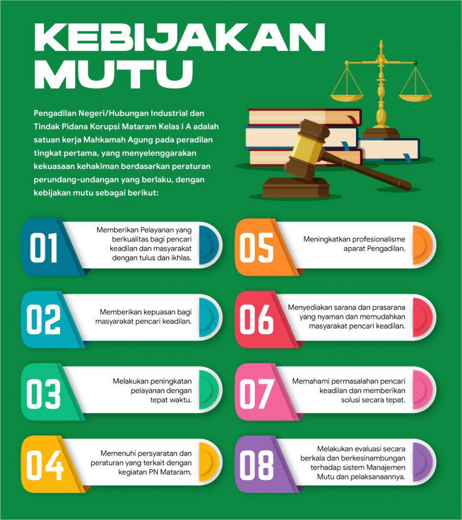 Pengadilan Negeri/Hubungan Industrial dan Tindak Pidana Korupsi Mataram Kelas I A adalah satuan kerja Mahkamah Agung pada peradilan tingkat pertama, yang menyelenggarakan kekuasaan kehakiman berdasarkan peraturan perundang-undangan yang berlaku, dengan kebijakan mutu sebagai berikut: