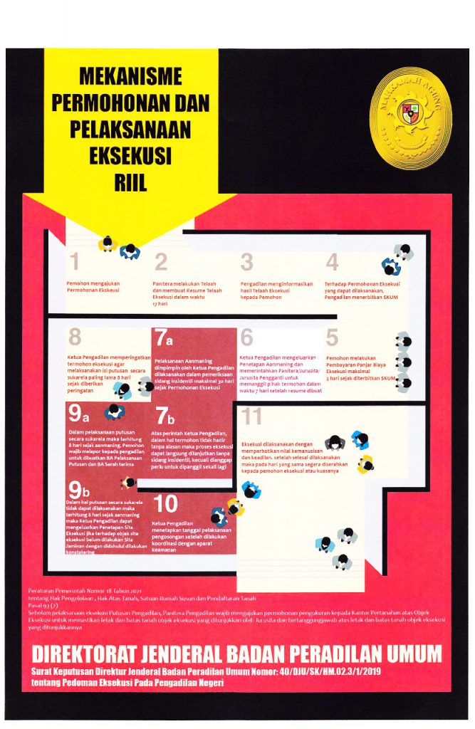 Berikut ini adalah Mekanisme Permohonan Dan Pelaksanaan Eksekusi Riil sesuai dengan Surat Keputusan Direktur Jenderal Badan Peradilan Umum Nomor 40/DJU/SK/HM.02.3/1/2019 tentang Pedoman Eksekusi Pada Pengadilan Negeri